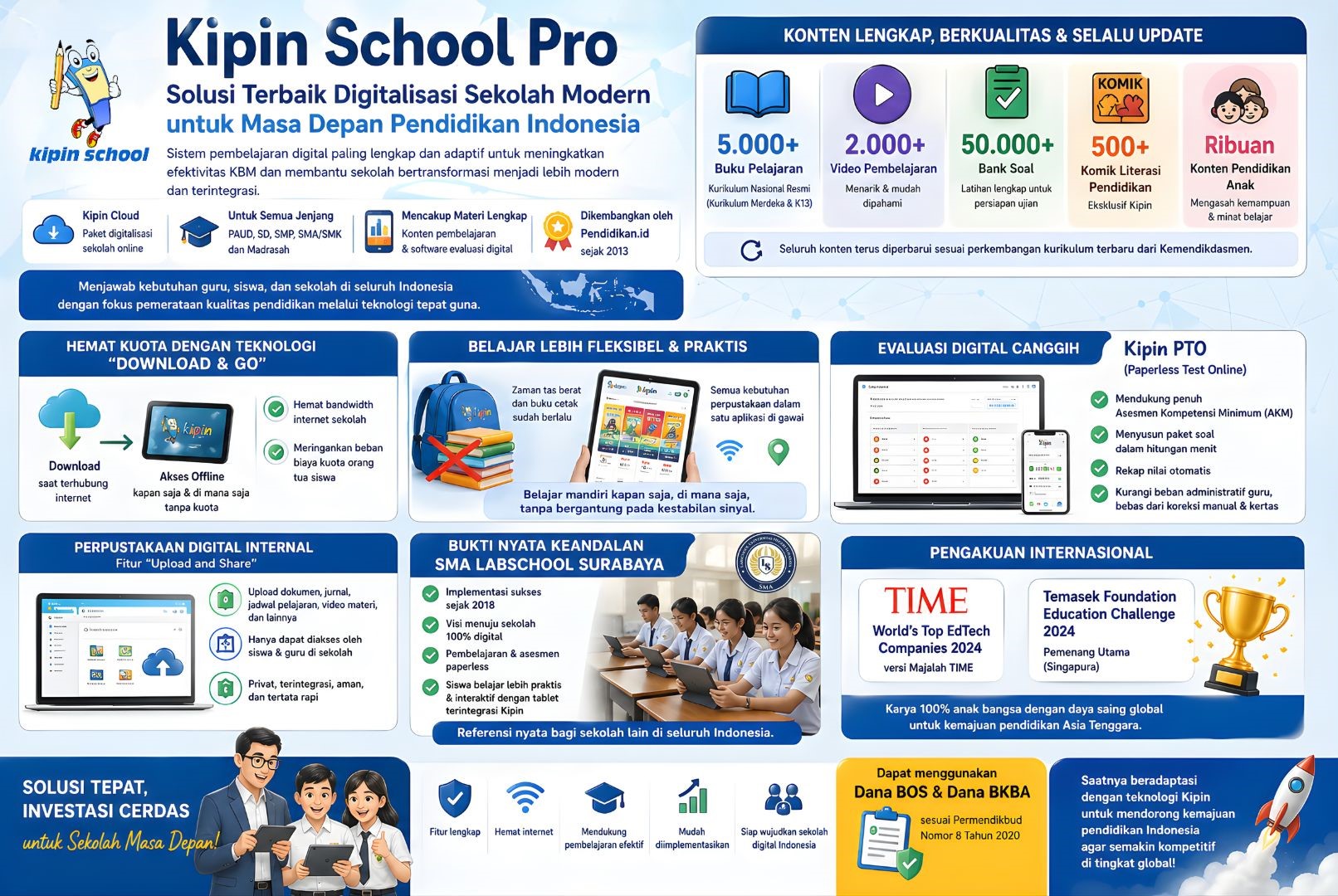 Pesatnya perkembangan di era digital merupakan keniscayaan yang harus dihadapi oleh seluruh elemen pendidikan di Indonesia dengan penyesuaian. Untuk mendukung sekolah yang telah memiliki akses internet, Kipin School Pro (atau dikenal juga sebagai Kipin Cloud) hadir sebagai sistem pembelajaran digital yang paling lengkap dan adaptif. Solusi ini dirancang untuk meningkatkan efektivitas kegiatan belajar mengajar (KBM) sehari-hari, sekaligus membantu sekolah bertransformasi menjadi lebih modern dan terintegrasi.