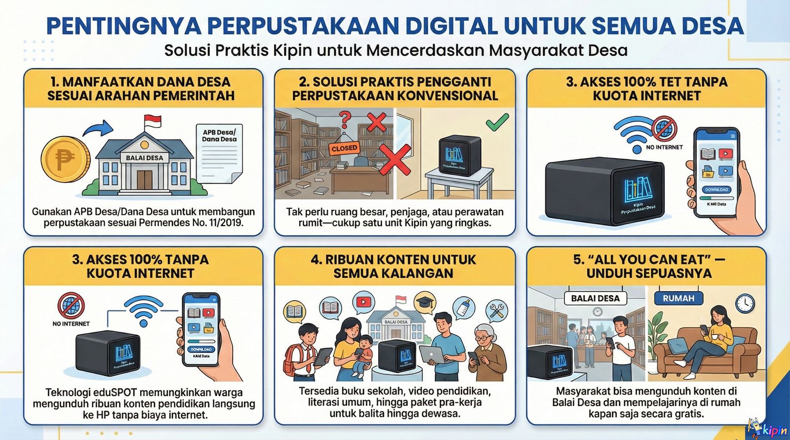 Pilihan Cerdas untuk Pemimpin Rakyat Membeli Kipin Perpus Desa bukan sekadar pengadaan barang, melainkan investasi strategis untuk memutus rantai kemiskinan antar-generasi melalui pendidikan. Perangkat ini bersifat “plug-and-play”; cukup dihubungkan ke listrik, dan dalam hitungan menit, sebuah desa sudah memiliki perpustakaan digital tercanggih yang diakui dunia melalui penghargaan dari TIME, Forbes, dan MIT.