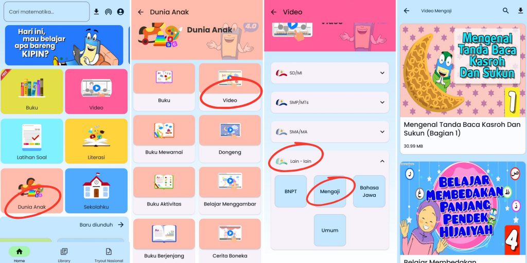 Video Mengaji Kipin dapat diakses melalui aplikasi Kipin School 4.0 pada menu video di jenjang “lain lain” dan konten “video mengaji”, tersedia di Android, iOS, dan Windows. Dengan fitur download & go, konten dapat diunduh sekali dan dinikmati secara offline tanpa koneksi internet. Pendekatan terstruktur dan visual interaktif ini menjadikan Video Mengaji Kipin sebagai solusi praktis untuk membantu anak belajar membaca Al-Qur’an dengan lebih mudah.